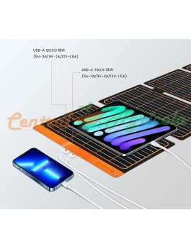 Sistema de carga solar de doble puerto: equipado con 1 puerto USB-A (QC3.0) y 1 puerto USB-C (PD3.0), que ofrece hasta 18 W de salida combinada (5V/3A, 9V/2A, 12V/1.5A).