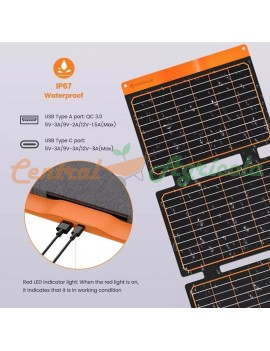Paneles de alimentación solar de carga inteligente: el IC integrado hace que la función de reinicio automático que permite que la carga constante se haga realidad incluso cuando se mueve dentro o fuera de la sombra y detecta los dispositivos conectados y proporciona una carga optimizada, y una luz LED incluida muestra el estado de carga.