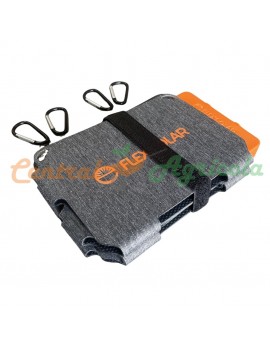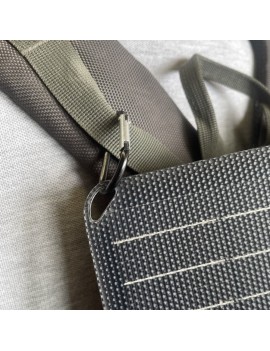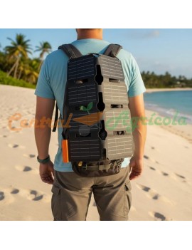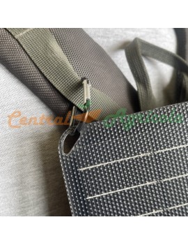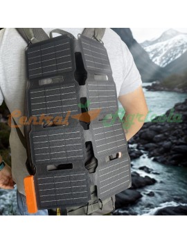 Se despliega a una superficie solar de (490x355x18mm) con 4 ojales colgantes reforzados y mosquetones incluidos para cargar las manos libres durante el senderismo/escalada.